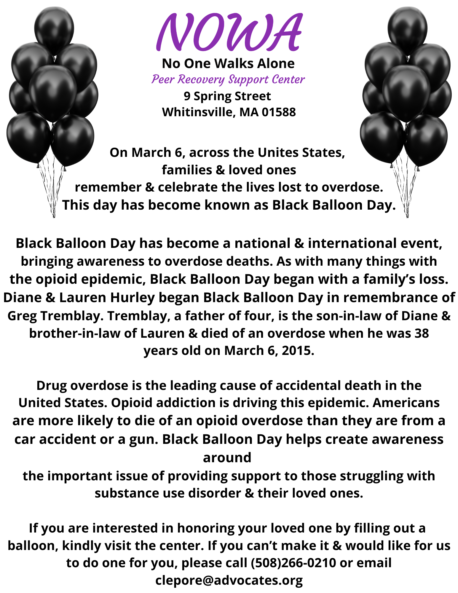 No One Walks Alone is a safe place where peers and loved ones support and empower one another. NOWA is an atmosphere of positivity and compassion. We believe in each other and honor all pathways to recovery, while embracing a new way of life in recovery. Our goal is to inspire, motivate and encourage the Blackstone Valley community by showing recovery is possible!